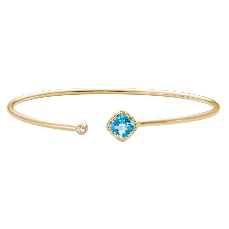 14K YG Bracelet. Blue topaz and diamond 2mm rounded memory wire bangle; 60mm x 50mm (inside diameter). 1 cushion 6mm swiss blue topaz totaling 1.15ct.; 1 round full-cut diamond totaling 0.03ct. Bezel-set with milgrain.