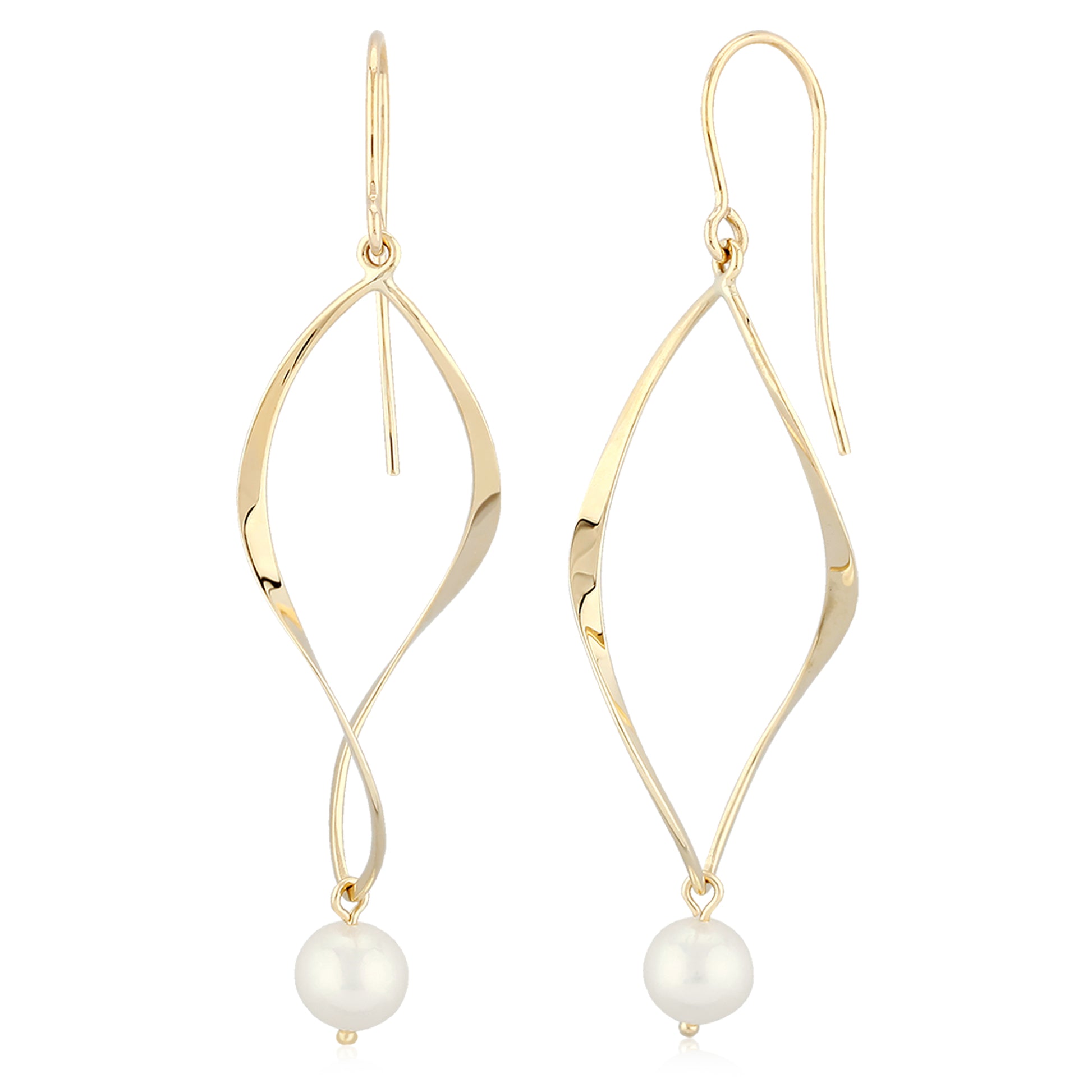 14k yellow gold curved rhomboid dangles with a white fresh water pearl.