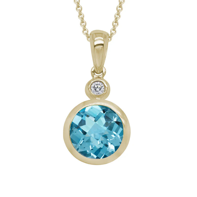 14K YG 16-18inch Necklace. 14mm(length) x 10mm(width) blue topaz & diamond drop pendant with bail; 21mm(total length) on 0.9mm adj cable chain w lob clasp. 1 round 8mm checkerboard swiss blue topaz = 2.30ct; 1 round full-cut diamond =0.03ct.; Bezel-set.