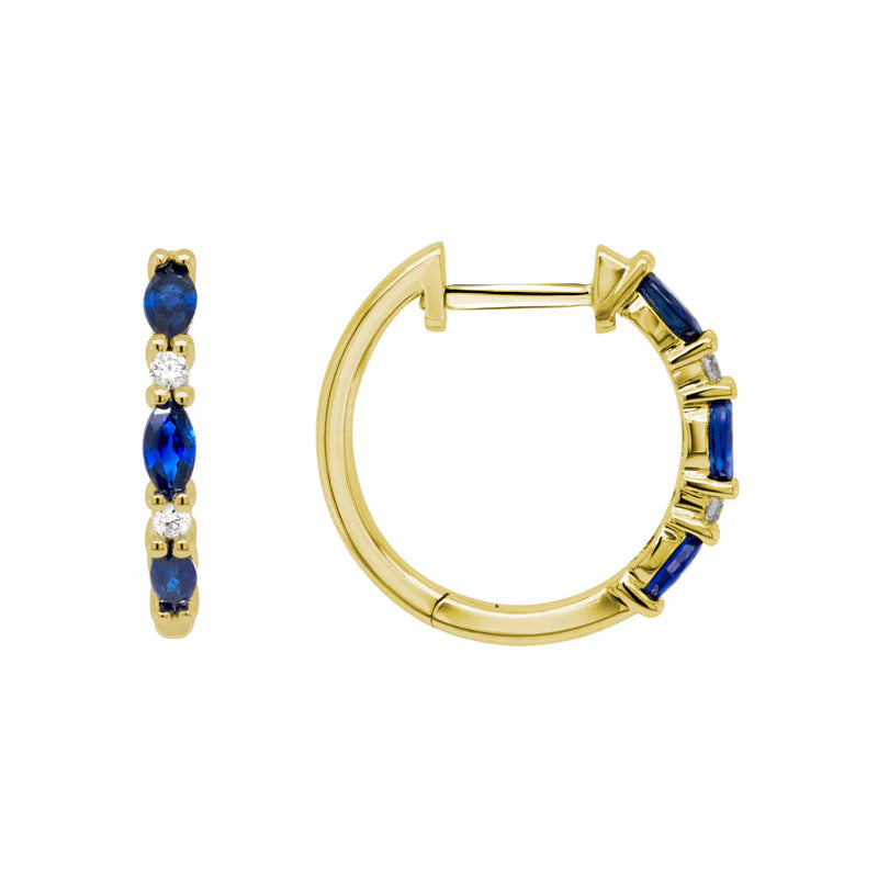 14K Yellow gold earrings. 17mm (length) x 2.2mm (width) blue sapphire and diamond huggies with snap-post closure. 6 marquise blue sapphires totaling 0.72ct.; 4 round full-cut diamonds totaling 0.06ct. Prong-set.