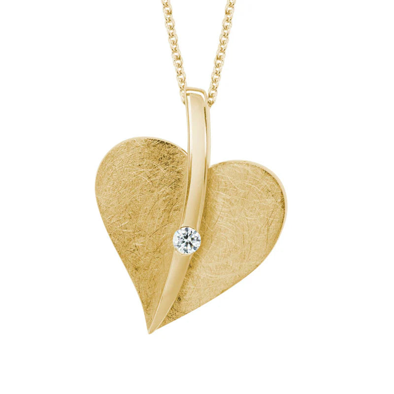Heart shaped pendant, brushed yellow gold with a modern bail seamlessly integrated with diamond set within.