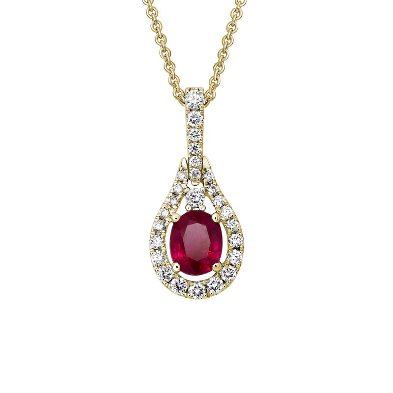 14K YG 16-18 inch Necklace. Ruby and diamond halo pendant. 11.5mm(length) x 7.5mm(widest) plus 8mm diamond bail; 16.6mm(total length) on 0.9mm adj cable chain w lobster clasp. 1 oval 5mmx4mm ruby =0.40ct.; 26 round full-cut diamonds =0.19ct. Prong-set.